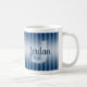 Striped coffee mug with customised name and monogram in shades of dusty slate blue, midnight & navy blue, and soft grey. The name and initial are easily customisable or can be removed if desired. Classic vertical stripes are timeless and tasteful. This simple modern cup makes an elegant personalised gift for him or her for any occasion: birthday, anniversary, Christmas, etc.; or as a groomsman or bridesmaid gift for a wedding with blue colours or nautical theme.