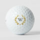 Titleist Pro V1 Golf Balls shown with a gold laurel wreath on a white background colour with a custom monogram letter.