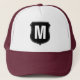 Monogram trucker hat with custom letter. Make your own cap in maroon red and other colours. Great idea for sports teams like baseball and softball. Personalised logo emblem shield with initial for men women and kids.