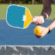 Pickleball purity in two solid colours. Clear mid blue and bright mango yellow. And in white, your initials in a fat serif font. A reduced, minimalist design – strong contrasts, clean lines, truly Zen.