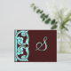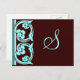 Personalizable monogram postcard with a deep chocolate brown background and a scripty letter and a vintage mediaeval art element in light teal blue. Use this single letter monogram template for weddings, birthdays, announcements or to add a personal professional touch to your letters. Click Customise It to change fonts or background colours.