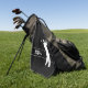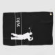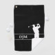 This distinctive golf towel features a white silhouette golfer in full swing. On the lower third is your monogram in white framed by thin white lines. The text and image are placed on a dramatic black background.