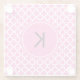 Monogrammed white on hot pink quatrefoil pattern glass coaster.