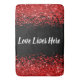 Step into comfort and style with our luxurious monogram bath mat. This elegant bath mat features the heartfelt message "Love Lives Here" in a pristine white text, creating a striking contrast against a bold black background. The top and bottom edges are beautifully adorned with a shimmering red glitter border, adding a touch of glamour and sophistication to your bathroom decor.