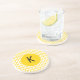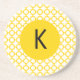 Monogrammed yellow quatrefoil pattern on white background sandstone coaster.