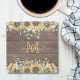 This elegant stone coaster features yellow sunflowers, eucalyptus leaves, and a custom monogram on brown wood, adding a floral botanical touch!