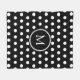Fleece blanket with a black and white polka dots pattern and personaized white monogram on a black embellished round lable in the center. Type your monogram in the template field to personalize it. Matching home decor available at Dots & Stripes Design Studio.