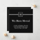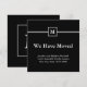 This moving announcement can be customised with your monogram, name and new address. At the top, there's a square for your monogram. The text is white. The background is black.
