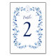 Elegant Blue and white Delft flowers and vines Table number with couples monogram.