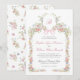 This monogrammed wedding invitation features soft watercolor wildflowers arranged in a graceful Victorian-inspired frame, accented with a delicate blush pink bow and refined botanical details. The romantic front design is paired with a coordinating floral pattern on the back, creating a cohesive and timeless look. Inspired by an English garden, the overall aesthetic feels elegant, airy, and classically romantic.