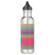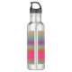 A custom water bottle with a colourful horizontal stripe pattern and a single monogram initial in the centre.