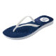 Flip flops with white straps featuring dark blue abstract image with white dots and easily customisable monogram in a white round frame in matching blue shade.