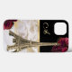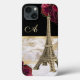 This beautiful Eiffel Tower iPhone case design features a golden graphic of the Eiffel Tower on a black and white and gold marble background with red roses. Personalise with your monogram!