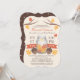 The bride to be has fallen in love! A beautiful fall themed bridal shower invitation with an oak tree branch and golden yellow and orange autumn leaf design with an orange ribbon look banner with white hearts flanking the event year and a mason jar with a lit candle and autumnal leaves at the bottom of the jar. Acorns flank each side of the glass jar and can be monogrammed with the initial and monogram of the bride and groom to be. The back of the invitation is dark brown with a polka heart pattern. Artwork © Chrissy H. Studios, LLC. All rights reserved.