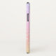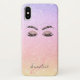 Sparkling iridescent modern feminine phone case with makeup eyes and brows over an ombre holographic pink blush, purple mauve, and yellow gold faux glitter background. +++++++++++++++ Personalise it with your name and pink monogram / name initial.++++++++++ It could be a pretty personalised gift for a fashion lover, makeup artist or beauty salon owner.
