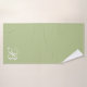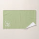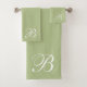 An elegant monogrammed sage green towel set with white initials. A perfect style accent colour for an earthy neutral spa vibe bathroom.