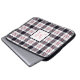 This personalised laptop sleeve features a modern tartan (plaid) pattern with stripes in white, reddish pink and black and a framed monogram in matching colours.