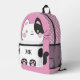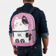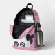 Cute kids backpack in pink with a black and white cat with cute little paws and a chubby tail and your daughter's initials in a quirky hand writing font. Send your daughter back to school with this cute animal backpack with a black and white cat with blushing cheeks and green eyes and adorable little paws. Cat backpack in pink for a little girl who loves kittens personalised with her initials.