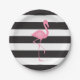 Monogrammed Pink Flamingo + Black + White Stripes Paper Plate