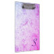 Design features a pink and purple marbled background on both front and back. Front features the initial you supply in a fun, purple font.