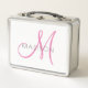 Monogrammed pink script initial and name metal lunch box for a girl. Pretty pink and black lettering on a silver lunch box.