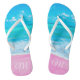A cute pair of flip flops featuring a beautiful photograph of a tropical beach with pink sand, along with a custom monogram on the heel of the shoe. The perfect vacation accessory for someone who likes travelling to tropical beaches with pink sand.