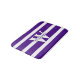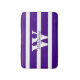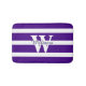 Stylish bath mat, done in a bright purple bold striped pattern. A custom large white one letter monogram, in the middle of the mat, and purple text, is ready to personalise for yourself or as a great gift idea. Comes in three sizes.