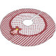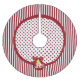 Festive Christmas tree skirt done in a fun layered look, of red and white stripes and red and white polka dots, with a red band, between them. Graphics of red Christmas ball ornament, with a red bow, decorates the front of the skirt, and has a single white letter monogram ready to personalise.