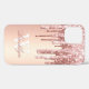 Modern, girly pink rose gold glitter sparkle drips custom personalised name and monogrammed iphone case. This design features blush pink rose gold glitter sparkle drips on pink metal look background with monogram initial and first name text template. Perfect feminine gift. If you need help or matching items, please contact to me.