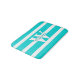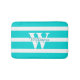 Stylish bath mat, done in a bright teal bold striped pattern. A custom large white one letter monogram, in the middle of the mat, and teal text, is ready to personalise for yourself or as a great gift idea. Comes in three sizes.