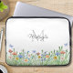 This floral laptop sleeve is decorated with delicate watercolor flowers, foliage, and butterflies in pastel colours.