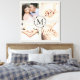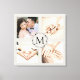 Add four photos and monogrammed initial to the front of elegant canvas print with wreath and linen effect background. Perfect for the newlyweds new home.