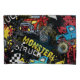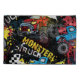 Abstract seamless Monster Car pattern on grunge shape cracked background with shabby dots and spray paint texture, ink. Childish style wheel auto repeated decor.