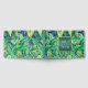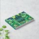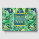 A beautiful green, golden yellow and dark blue seamless pattern comprising of monstera jungle leaves that has a dark faux shimmer teal blue square inlay on the front cover on which a text template for your custom wording reads "guest book" on the front and another on the spine is for your personalised. Both text templates are real foil creating a timeless and luxury look to the cover.