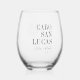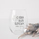 Impress your destination wedding guests with these chic and modern personalised stemless wine glass wedding favours. Design features a dark green monstera leaf illustration with your wedding destination aligned at the right (shown with Cabo San Lucas) in classic serif lettering. Add your names beneath in handwritten cursive script, as well as the year. Leaf position can be adjusted, and colours can be changed to match your wedding colours using Zazzle's design tool.