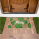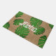 Doormat with green Monstera leaves: Aloha Hawaiian greeting text design using casual script fonts It has a background that looks like burlap, and the text is surrounded by digitally painted tropical green leaves. It has a nice summer feeling. Design by Alma Wad