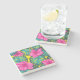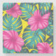 Monstera Leaves and Hibiscus, Teal Pink on Yellow Stone Coaster