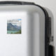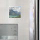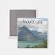 Square fridge magnet that features a scenic photo image of Montana landscape in Glacier National Park that includes the Northern Rockies and a colorful, teal blue lake.