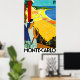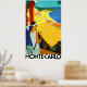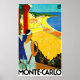 This vintage advertising poster is for Monte-Carlo. It shows a man and woman in tennis outfits looking down at the beach. The colours are vibrant blues, oranges and greens.