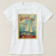 This Greetings From Monterey California vintage travel nautical design features a boat sailing on the water with seagulls and a blue sky filled with gorgeous puffy white clouds.