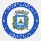 The coat of arms of Montevideo is infused into a circle shape, which itself, is decorated in the national flag colors of Uruguay. The added text around the circle are seperated in decorative stars.