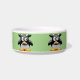 This is a heavy, durable bowl decorated with Tibbies of many colors, the perfect size for hungry/thirsty Tibs. The design is interesting and printing clear.