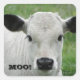 A white cow with black ears, eyes, nose and the longest eyelashes gazes into the camera to have her portrait taken.