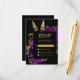 This elegant, moody wedding RSVP enclosure card features a lush, romantic floral bouquet in purple with gold faux foil and glitter foliage on a black background. Customise the gold-coloured text in stylish fonts on a black rectangle. The back of the card is solid black.