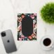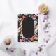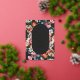 A moody and classy wedding invitation with multi-colour watercolor Dutch still life flowers surrounding a pill frame, on charcoal background. All text is in gold foil. The reverse features a pattern of flowers.