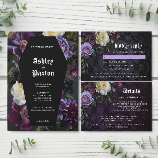 Moody Elegant Purple Gothic Garden Floral Crow Invitation