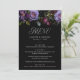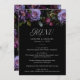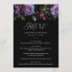 Elegant moody floral wedding menu featuring a top border of purple and burgundy flowers, lush green foliage, and dark berries. The purple floral wedding menu is complimented by elegant, modern typography. Personalise the front of the gothic floral wedding menu with your names, wedding date, and menu options. The back of the purple floral wedding menu displays a matching floral pattern. Designed to coordinate with our Moody Gothic Floral wedding collection.