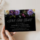 Elegant moody floral wedding save the dates featuring a top border of purple, ivory, and burgundy flowers with lush green foliage and dark berries. "Save The Date" is displayed in elegant, modern typography. Personalise the purple floral save the dates with your names, wedding date and location, and wedding website. The design coordinates with our Moody Gothic Floral wedding collection.