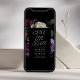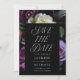 Elegant moody floral wedding save the dates featuring a background of purple, ivory, and burgundy flowers with lush green foliage on a black background. "Save The Date" is displayed in elegant, modern typography. Personalise the purple floral save the dates with your names, wedding date, and location. The design coordinates with our Moody Gothic Floral wedding collection.