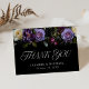 Moody floral wedding thank you card featuring a top border of ivory, purple, and burgundy flowers with lush green foliage and dark berries. The elegant purple floral design is complimented by "thank you" displayed in modern typography. Personalise the wedding thank you card with your names, wedding date, and typed or handwritten message. The gothic floral wedding thank you card is perfect for your fall or Halloween wedding. Designed to coordinate with our Moody Gothic Floral wedding collection.
